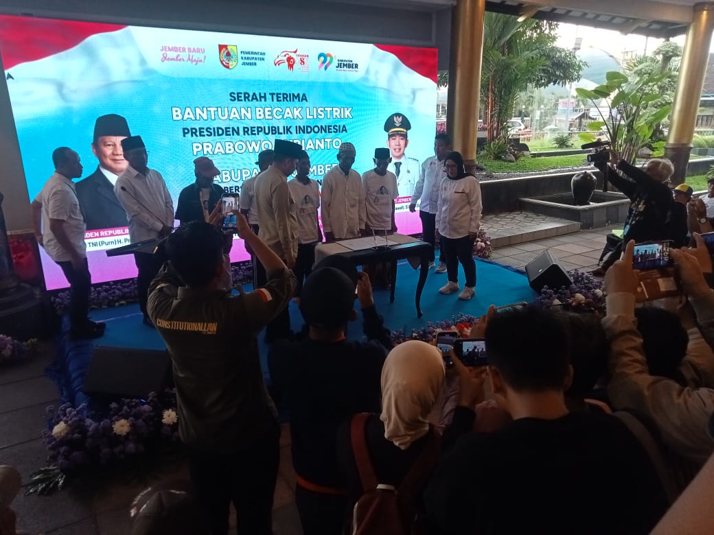 Acara pemberian program bantuan presiden Prabowo 100 Becak listrik sore tadi diserahkan kepada Abang becak lansia di pendopo Wahyawibawa graha Jember.