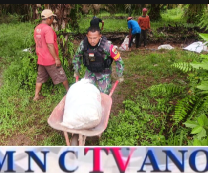 Lampung Timur, Lampung. mnctvano.com,- Babinsa Koramil 429-03/Marga Tiga Kodim 0429/Lamtim Sertu Edi Susianto bersama warga Desa Gedung Wani melaksanakan gotong-royong penimbunan jalan longsor di tepian sungai Way Sekampung akibat curah hujan, Selasa (24/02/2026).