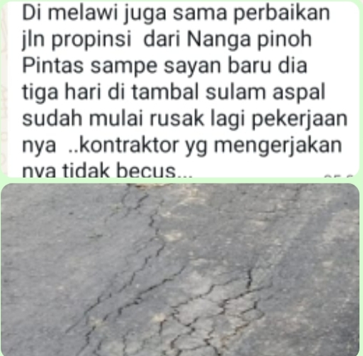 “Di melawi juga sama perbaikan jln propinsi dari Nanga Pinoh -pintas sampe sayan baru dia tiga hari ditambal sulam aspal,sudah mulai rusak lagi pekerjaannya,… kontraktor yg mengerjakannya