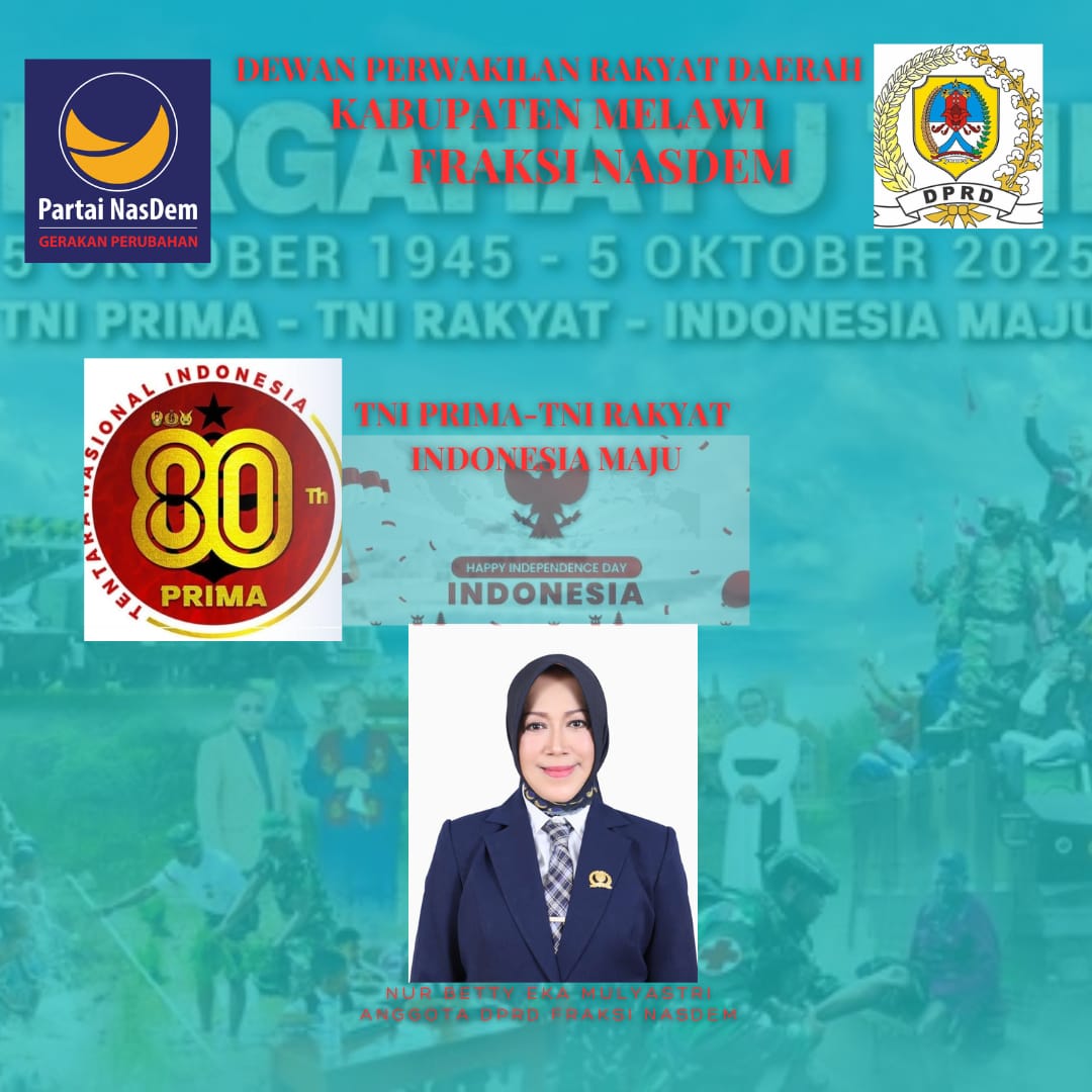 DEWAN PERWAKILAN RAKYAT DAERAH, KABUPATEN MELAWI FRAKSI NASDEM Musa mnctvano.com4 Oktober 202518 Dilihat Dirgahayu TNI Ke – 80 TNI PRIMA – TNI RAKYAT – INDONESIA MAJU NUR BETTY EKA MUL YASTRI Anggota DPRD Fraksi Nasdem Post Views: 18 Pos terkaitBPJN Sulut Tutup Sementara Ruas Jalan Kaiya–Kotamobagu, Pasang Jembatan Bailey untuk Pulihkan Akses NasionalBPD Hili Alo’oa Bantah Isu Penyelewengan ‘Dana Desa 2020-2023, Bukan Fiktif’Bupati Sikka Terima 20 Sertifikat Tanah Pemda Dari Kantor Badan Pertanahan Nasionalkepala sekolah inisial ‘SS’ SMK Negeri 3 SIBOLGA Di Teriaki Siswa Kejuruan Akademik, Mengatakan Segera Mundur Dari Jabatannya.Makin merajalela Tambang Emas Ilegal Sesuai Temuan Di Lapangan, Terus beroperasi Diduga Pengusaha Tambang Kebal Hukum.