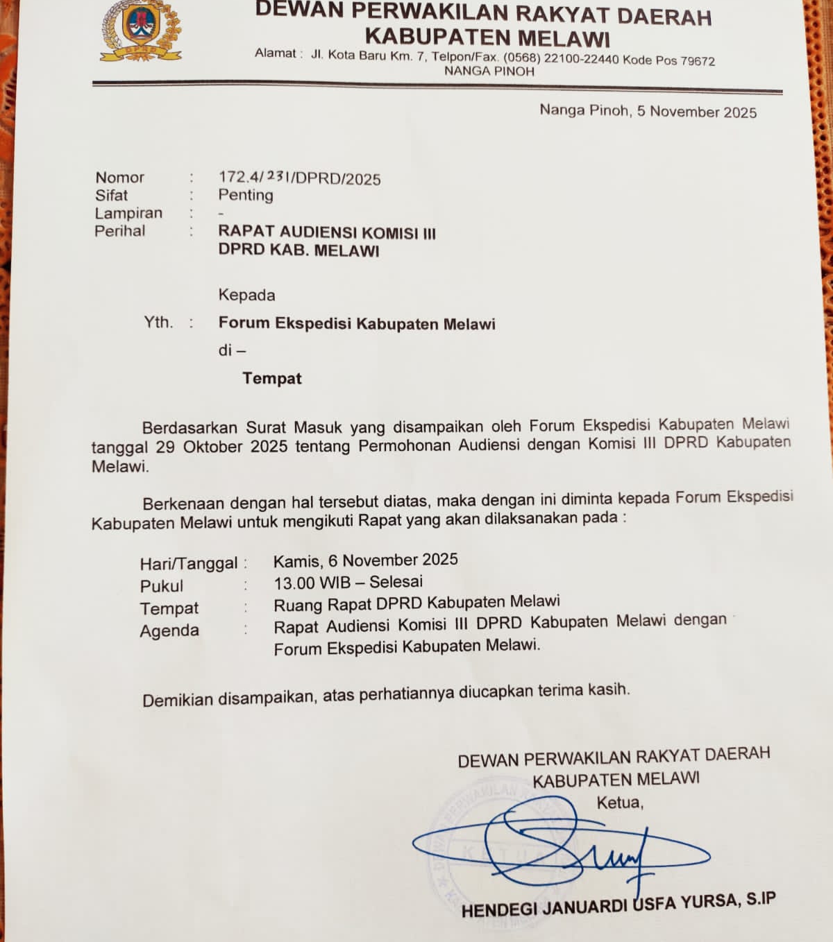 Dalam surat yang ditandatangani lansung oleh Ketua DPRD Melawi, Hendegi Januardi Usfa Yursa, S.IP, disebutkan bahwa audiensi ini merupakan tindak lanjut dari surat permohonan yang diajukan Forum Ekspedisi pada 29 Oktober 2025.