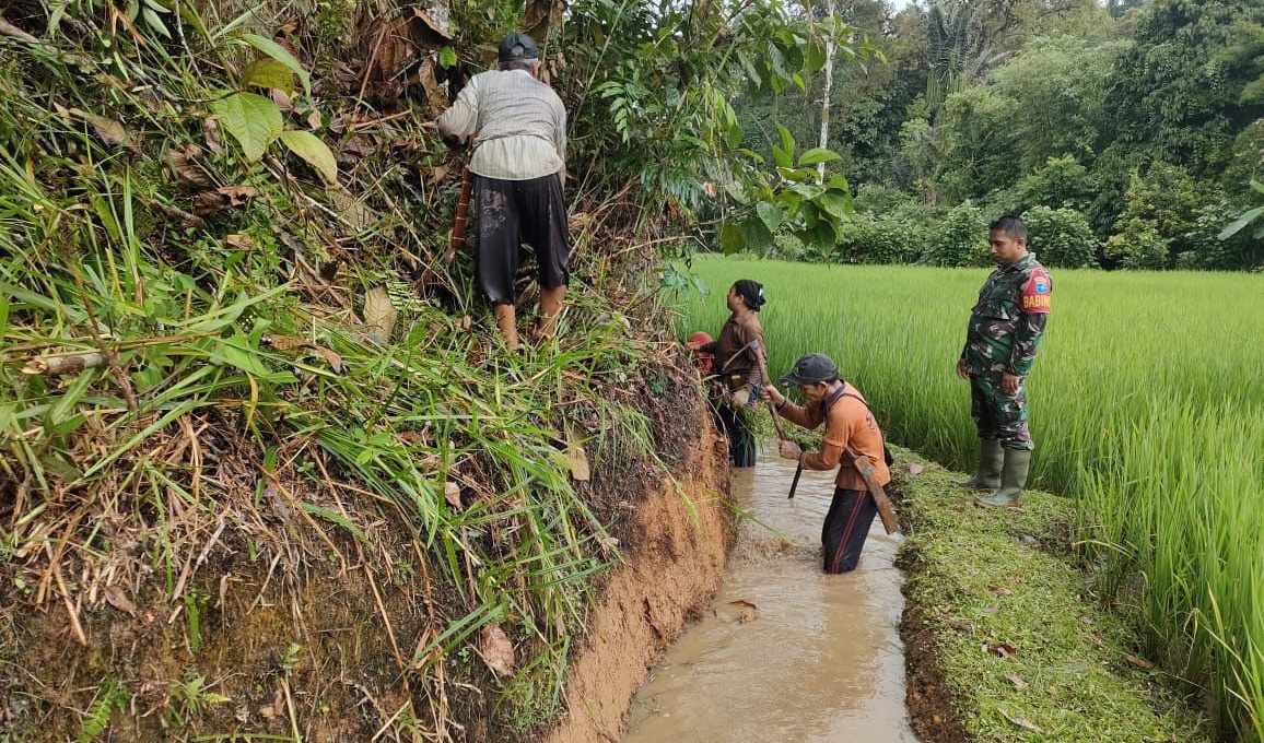 Kegiatan tersebut dilakukan sebagai bentuk kepedulian terhadap kebutuhan para petani, khususnya dalam memastikan aliran air tetap lancar menuju area persawahan. Parit yang sebelumnya mengalami pendangkalan dan tersumbat oleh rumput serta sampah, kini dibersihkan secara bersama-sama oleh Babinsa dan warga setempat.