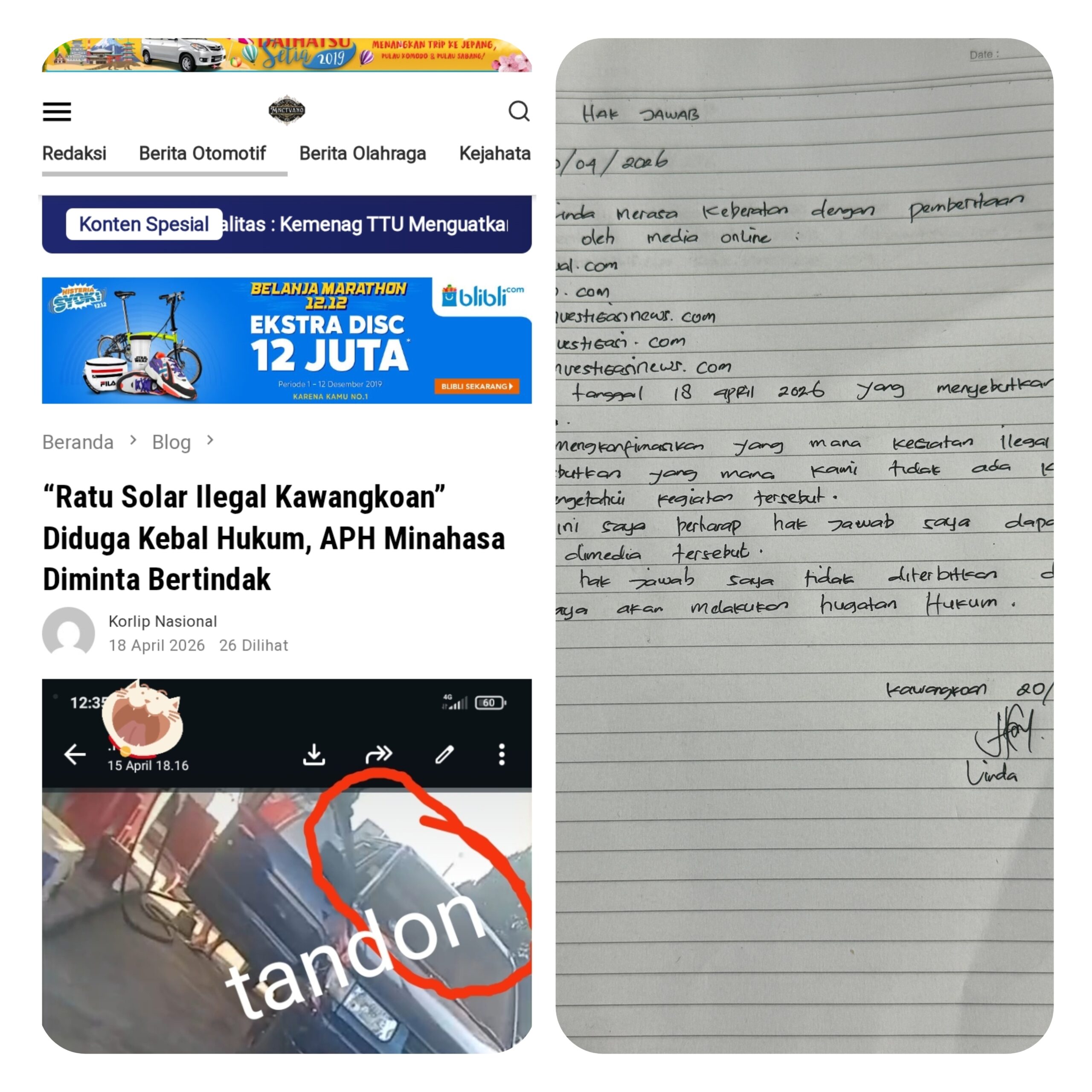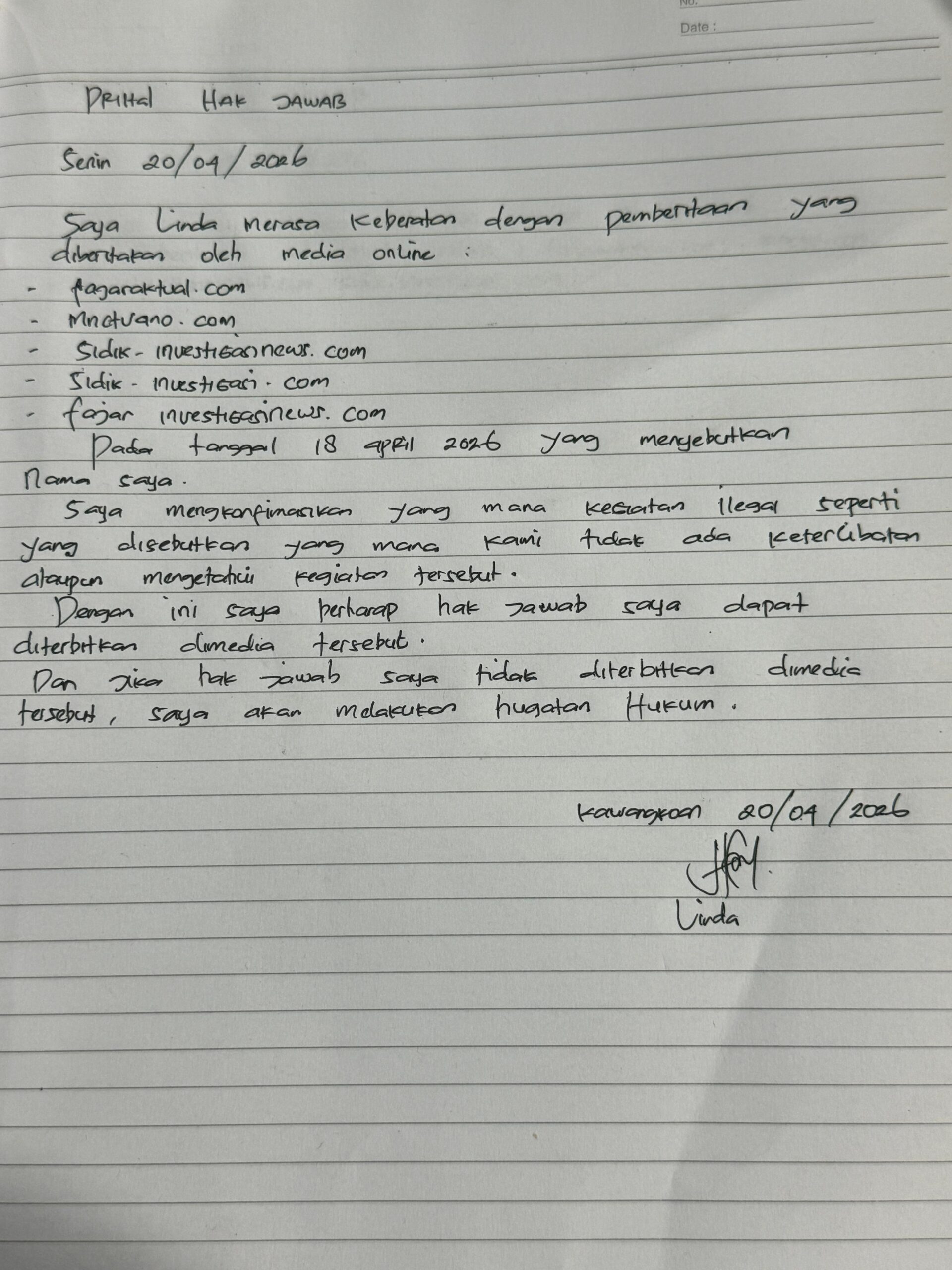 Sementara itu, pimpinan redaksi dari media terkait disebut telah melakukan konfirmasi langsung kepada Ci Linda pada tanggal 20 April 2026 sebagai bentuk klarifikasi atas informasi yang sebelumnya dipublikasikan.