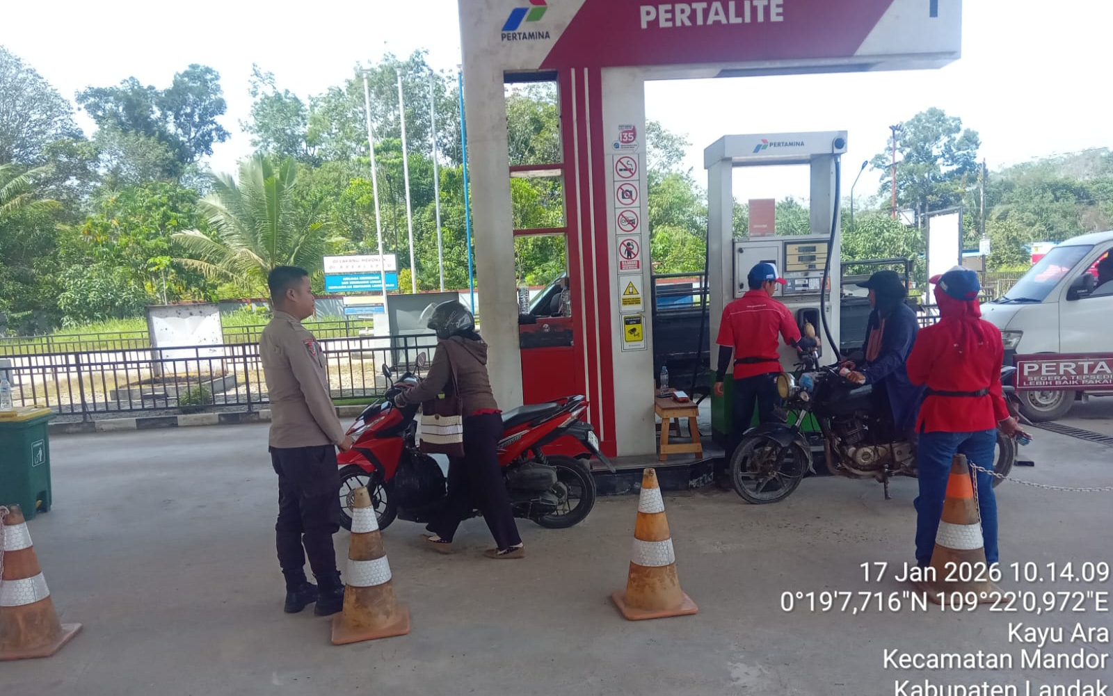 Polsek Mandor~ Polres Landak ~ Polda Kalbar ~Guna menjaga situasi kamtibmas tetap aman dan kondusif, personel Polsek Mandor melaksanakan patroli siang hari dengan menyambangi Stasiun Pengisian Bahan Bakar Umum (SPBU) serta berdialog langsung dengan masyarakat yang sedang mengantre BBM.