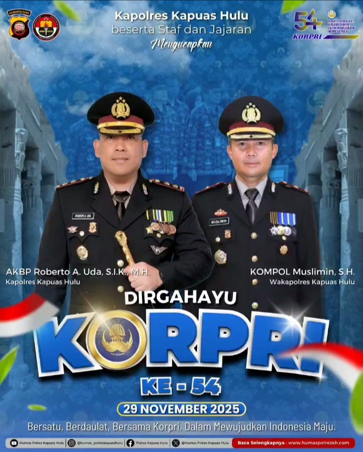 Kapolres Kapuas Hulu Beserta Staf Dan Jajaran Musa mnctvano.com29 November 202533 Dilihat Oplus_131072 Mengucapkan DIRGAHAYU KORPRI KE – 54 29 NOVEMBER 2025 AKBP Roberto A Uda,S.I.K.,M.H Kapolres Kapuas Hulu Post Views: 33 Pos terkaitBupati Lampung Timur Hadiri Haul KH Abdul Chalim Maftuhin dan Haul KH Maksum Ahmad Lasem.Tim SAR Gabungan Berhasil Menemukan Satu Jenazah Korban Bencana Tanah Longsor Pada Pencarian Hari ke 4PLN UIW MMU Teken MoU Pengamanan Objek Vital Nasional dengan Polda MalukuDandim 1206/Putussibau Pimpin Acara Tradisi Pelepasan PNS Purna Tugas : Terima Kasih Atas Dedikasi dan PengabdiannyaDandim 1206/Putussibau Pimpin Upacara Bulanan Dan Beri Jam KomandanPelaksana Proyek Kecam Provokasi Oknum LPK, Siapkan Langkah Pidana Berdasarkan KUHP Baru