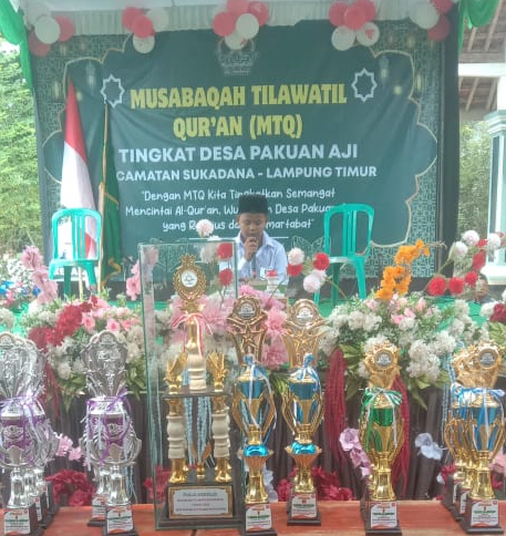 Musabaqah Tilawatil Qur’an tingkat desa pakuan aji dimulai pukul 08.30 wib s/d selesai.sambutan pertama untuk pembukaan acara kegiatan MTQ tingkat desa di pimpin langsung oleh Kepala Desa Pakuan aji (Tan Malaka).Dalam Sambutan pertama nya kepala desa pakuan aji (Tan Malaka) mengucapkan terima kasih atas terselenggaranya acara MTQ dan kerja sama Masyarakat desa pakuan aji.ia juga sangat mendukung penuh acara MTQ ini bisa berjalan setiap tahunnya dan berharap dengan adanya lomba MTQ dapat membangun mental putra dan putri untuk berani tampil di kalayak ramai yang nanti nya dapat melanjutkan ketingkat Kecamatan maupun Provinsi.