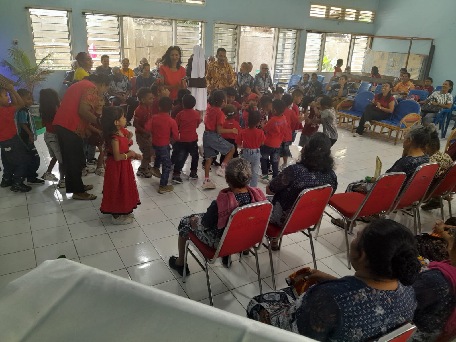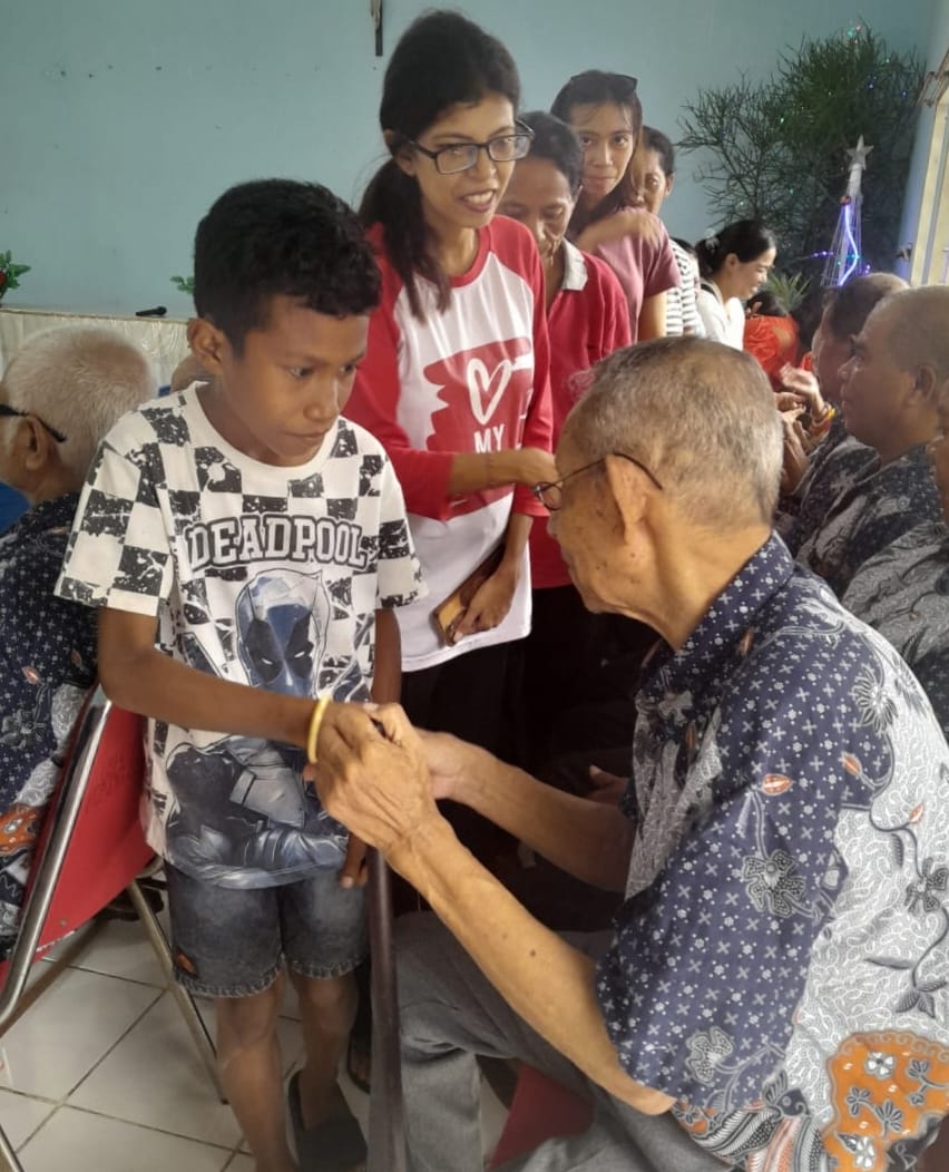 Setibanya di Panti Jompo dengan wajah ceria anak-anak bersalaman dengan opa dan oma penghuni Panti yang telah menunggu kedatangan anak-anak di Aula.