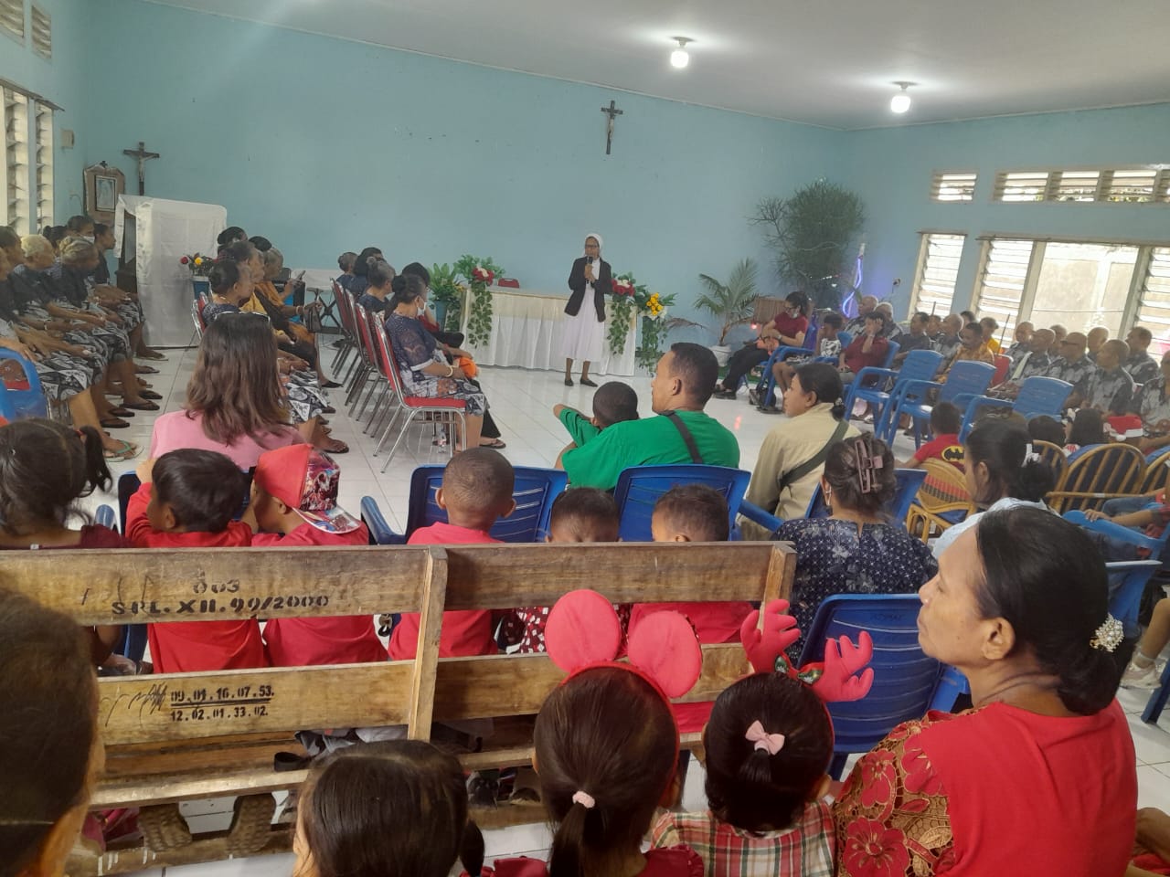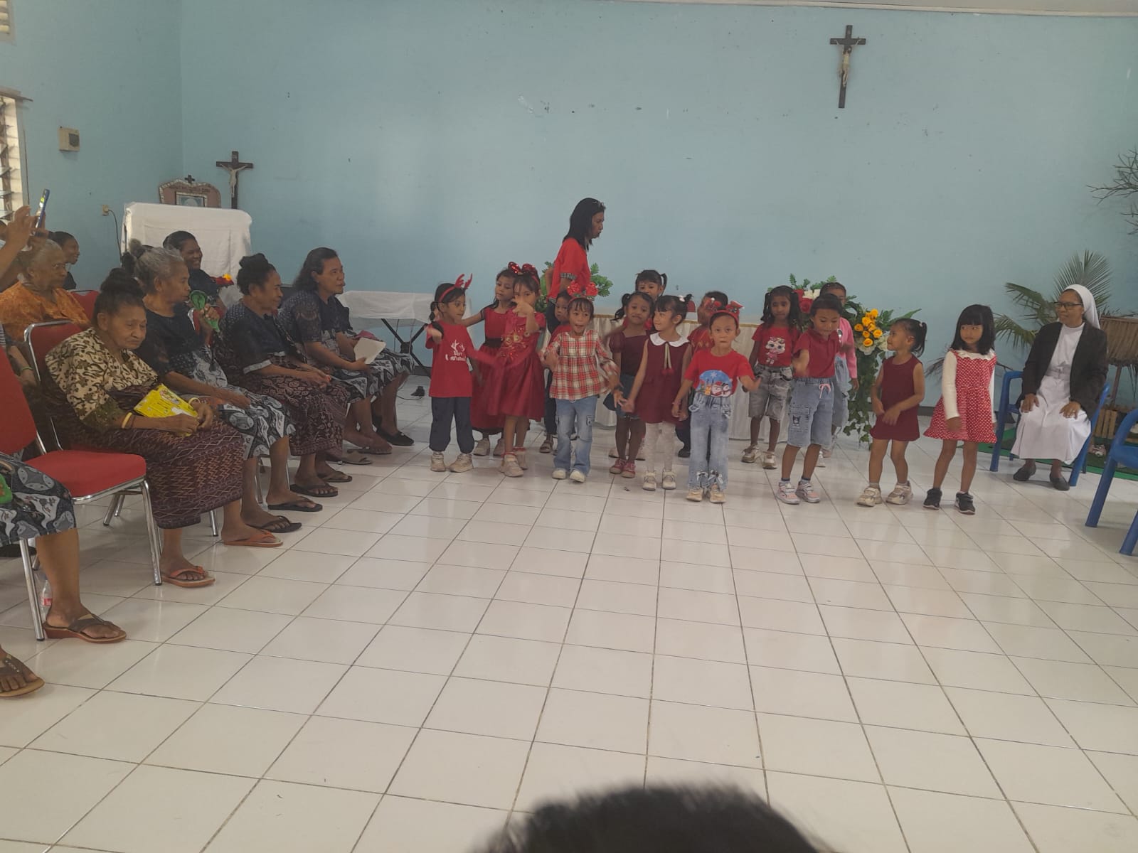 “Kehadiran anak TK di Panti Jompo ingin membagi kasih dan kecerian Natal. Dua tahun lalu juga kami mengunjungi di tempat yang sama. Kami tidak bawa apa- apa hanya doa dan hiburan, ” ujar Kepala TK Bina Wirawan Suster Eliana, CIJ dalam sambutan singkatnya.
