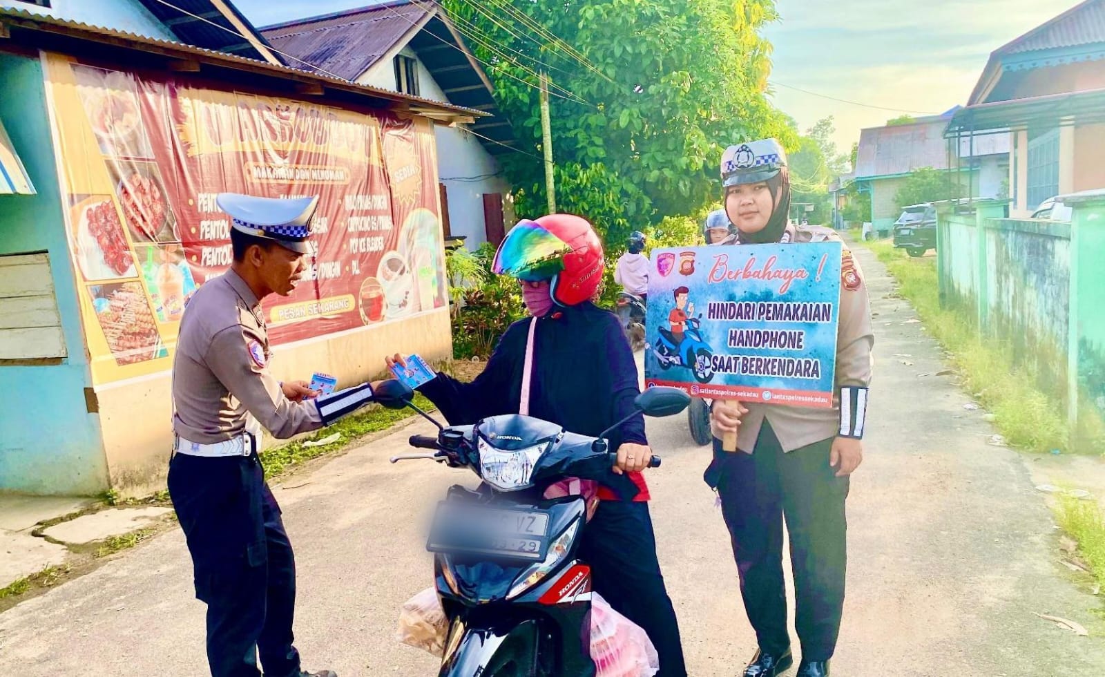 Dalam kegiatan tersebut, Satgas Preemtif juga membagikan brosur Millenial Road Safety to Zero Accident dan stiker imbauan Kamseltibcarlantas kepada pengguna jalan.