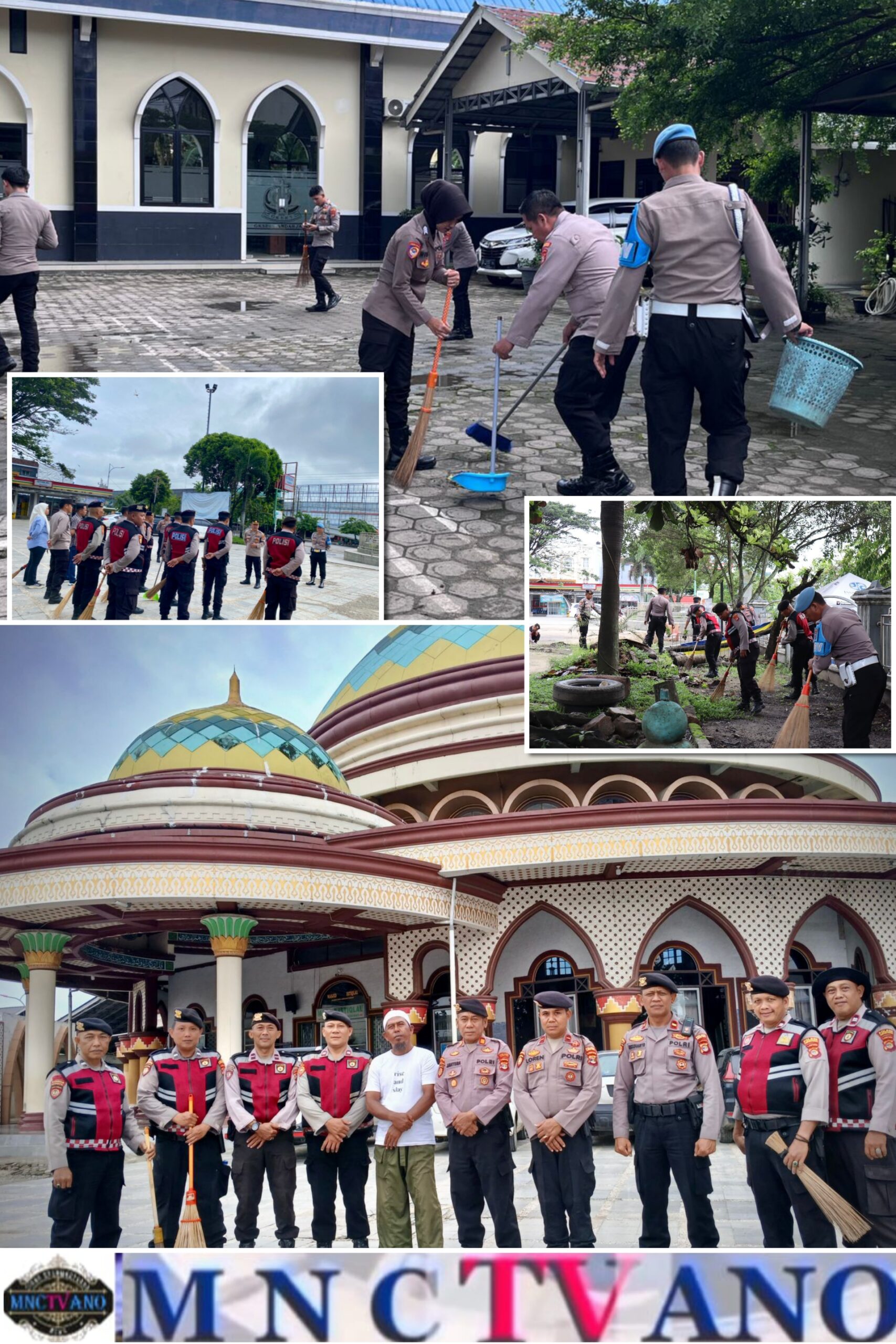 Lampung TengahMnctvano.com Personel Polres Lampung Tengah melaksanakan kegiatan bakti sosial berupa aksi bersih-bersih di sejumlah titik fasilitas umum dan tempat ibadah di wilayah Bandar Jaya, Jumat (6/2/2026).