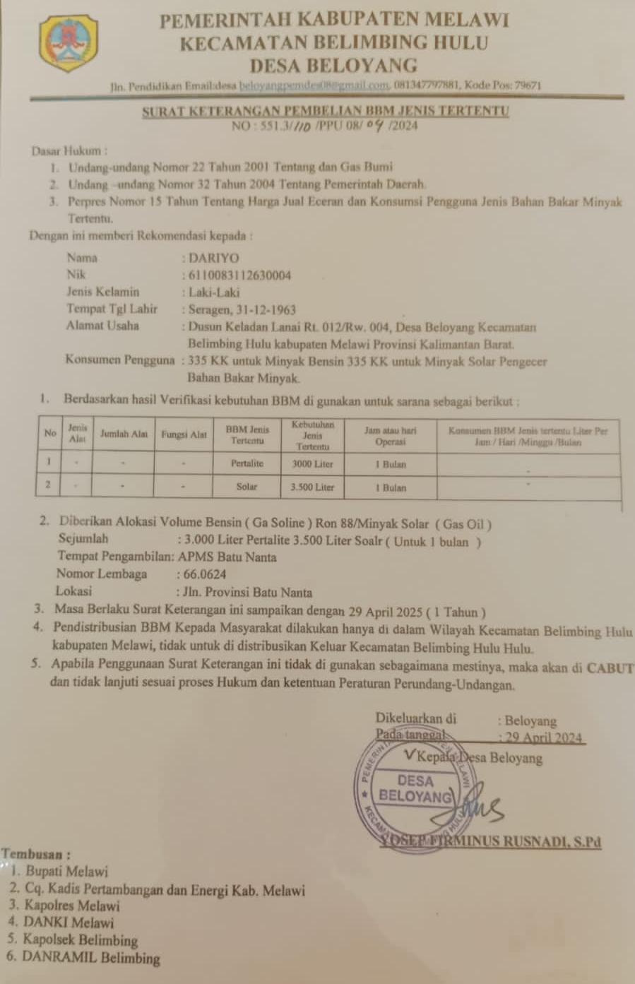 “Udin, pengawas SPBU Batu Nanta Kecamatan Belimbing Kabupaten Melawi menjelaskan, bahwa para petani dan nelayan yang memiliki surat rekomendasi bisa membeli BBM subsidi menggunakan jerigen sesuai kebutuhan, berdasarkan regulasi Peraturan BPH Migas Nomor 2 Tahun 2023.
