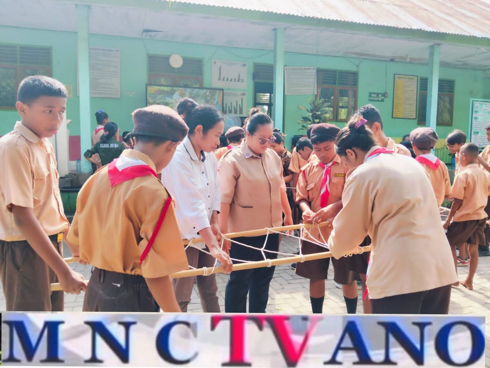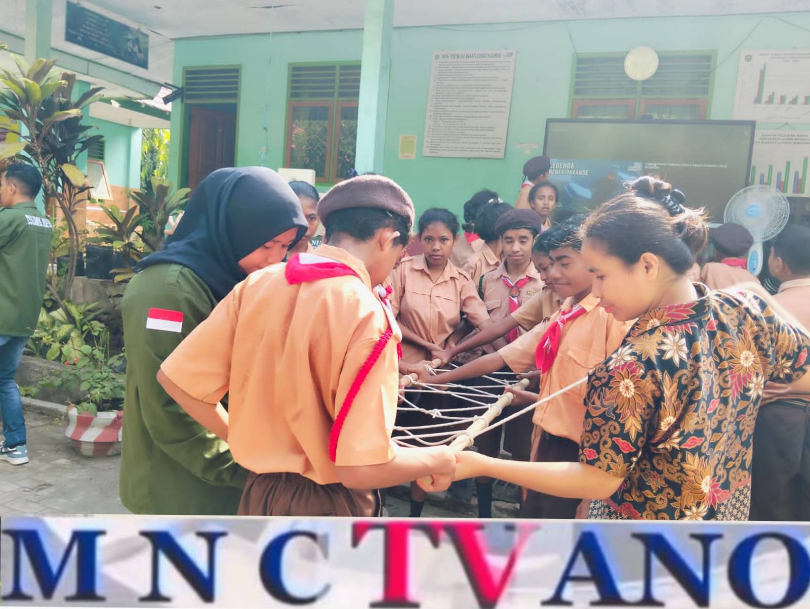 Para mahasiswa ini bersama para guru mendampingi peserta didik dalam kegiatan ekstrakurikuler pramuka, ketrampilan membuat tandu.
