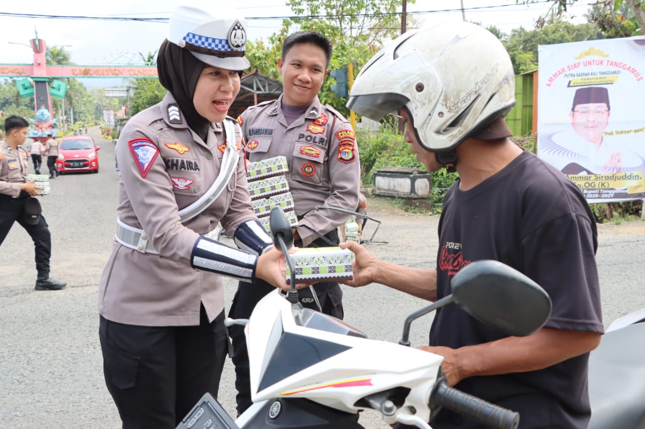 Dalam kegiatan tersebut, tim membagikan makanan kepada masyarakat pengguna jalan yang tertib berlalu lintas sebagai bentuk kepedulian dan upaya mempererat hubungan antara kepolisian dan warga.