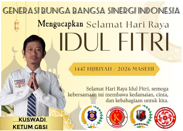 Karawang (Jabar), mnctvano.com – Dalam suasana penuh kebahagiaan dan keberkahan,keluarga besar Komunitas sosial dan Budaya Generasi Bunga Bangsa Sinergi Indonesia (GBSI) dan Komsosbud Kuswadinoise Indonesia, dengan penuh ketulusan mengucapkan Selamat Hari Raya Idul Fitri 1447 H/ 2026 M) kepada saudara sesama komunitas,ormas ataupun LSM,teman,dan seluruh saudara muslim di seluruh Indonesia pada khususnya,serta saudara muslim di Dunia