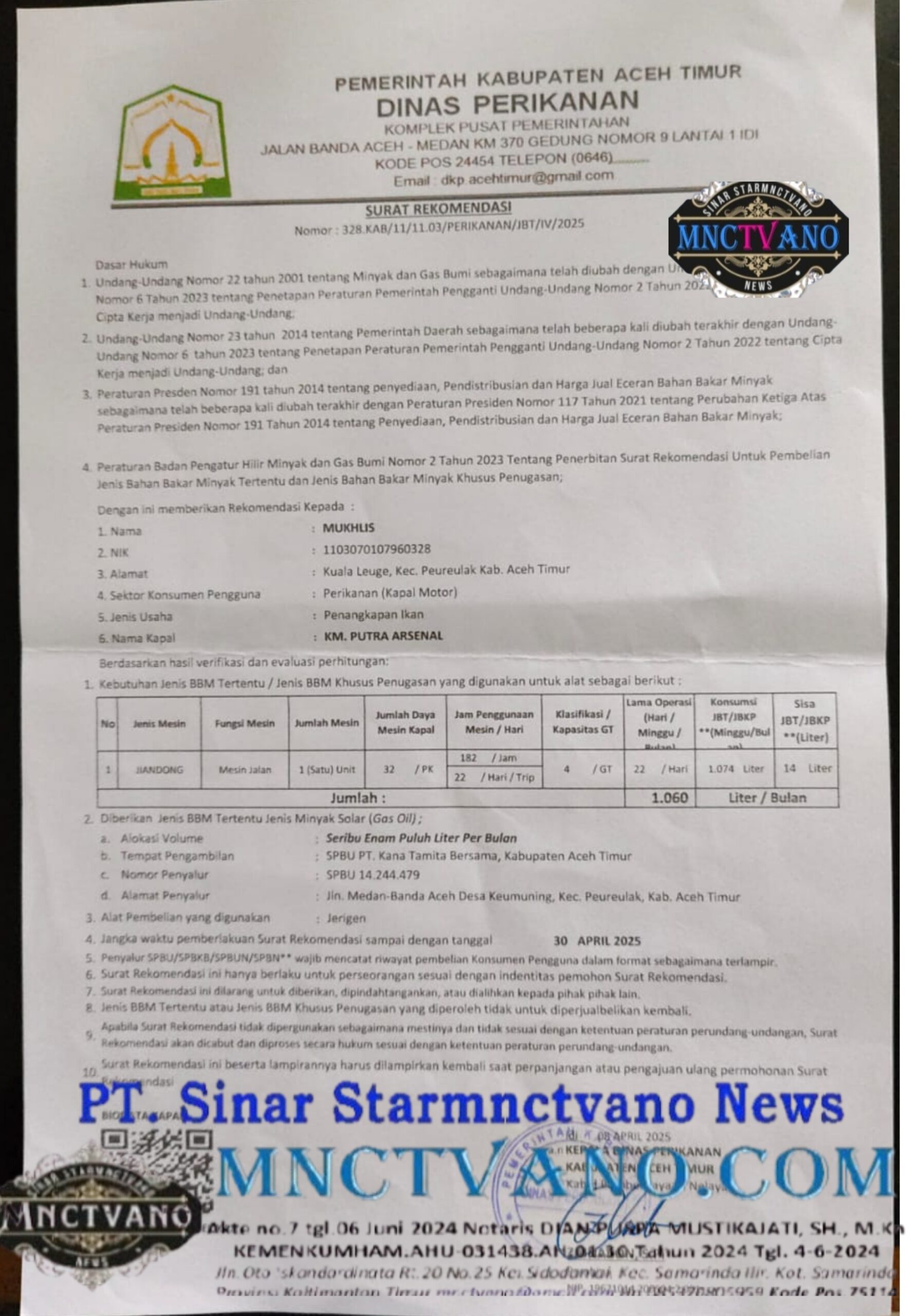 Diketahui yang mengisi BBM menggunakan jerigen pada tengah malam sekira pukul 02.00 Wib yang sudah mendapat rekomendasi dari dinas terkait atas nama : Mukhlis. Alamat. Kuala Leuge, Kecamatan Peureulak, Kabupaten Aceh Timur. Sektor Konsumen Pengguna. Perikanan (Kapal Motor). Jenis Usaha. Penangkapan Ikan. Nama Kapal. KM.Putra Arsenal.