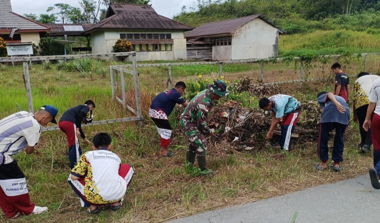 Embaloh Hulu, Kapuas Hulu – Dalam upaya menanamkan kesadaran akan pentingnya menjaga kebersihan sejak dini, Babinsa Koramil Embaloh Hulu melaksanakan kegiatan gotong royong bersama siswa-siswi SMPN 1 Embaloh Hulu dengan membersihkan lingkungan sekolah,