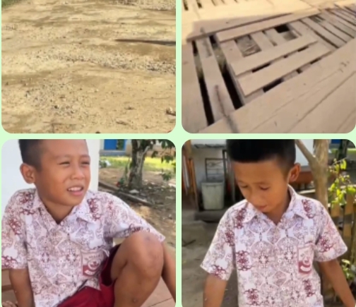 “Viral dalam rekaman yang beredar, seorang anak SD yang tinggal di kawasan tersebut turut menyampaikan keluhannya. Dengan polos, ia berharap pemerintah memperbaiki jalan dan jembatan yang selama ini menjadi akses utama warga. Bilang sama pemerintah, di sini banyak yang jatuh. Jalannya berlubang, jembatannya rusak,”ucap